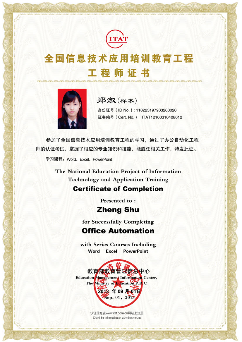 全国信息技术应用培训教育工程(简称ITAT教育工程),是教育部教育管理信息中心于2000年5月26日启动的一项面向全国的普及性实用信息技术人才培养工程。通过与IT各领域优秀企业进行积极的合作,深入发掘IT技术的典型应用和最新进展,建立了集培训、考试和认证于一体的采用开放式的认证体系。
