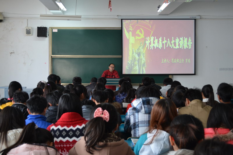 报告会邀请了思政部主任罗鸿为广大师生作了题为《以党的十大精神统领大学生思想政治工作》的报告。他在报告中阐述了学习党的十八的重要性和意义以及如何学习十八大,为什么要学习十八大,重点解说了一个主题、二个目标、三个自信、四个特色、五位一体、六条措施、七项任务、八点要求、九项部署、十大成就,要求当代大学生要真正把思想、行动统一到科学发展观上来。这场报告让学生不仅清晰地了解到党的十八大报告中的新思想、新观点和新论断,更对我党面对困难压力表现出来的坚定自信奋进的精神面貌感到由衷的钦佩。系领导,部分辅导员、班主任,学生党员、学生干部、入党积极分子及部分学生聆听报告。