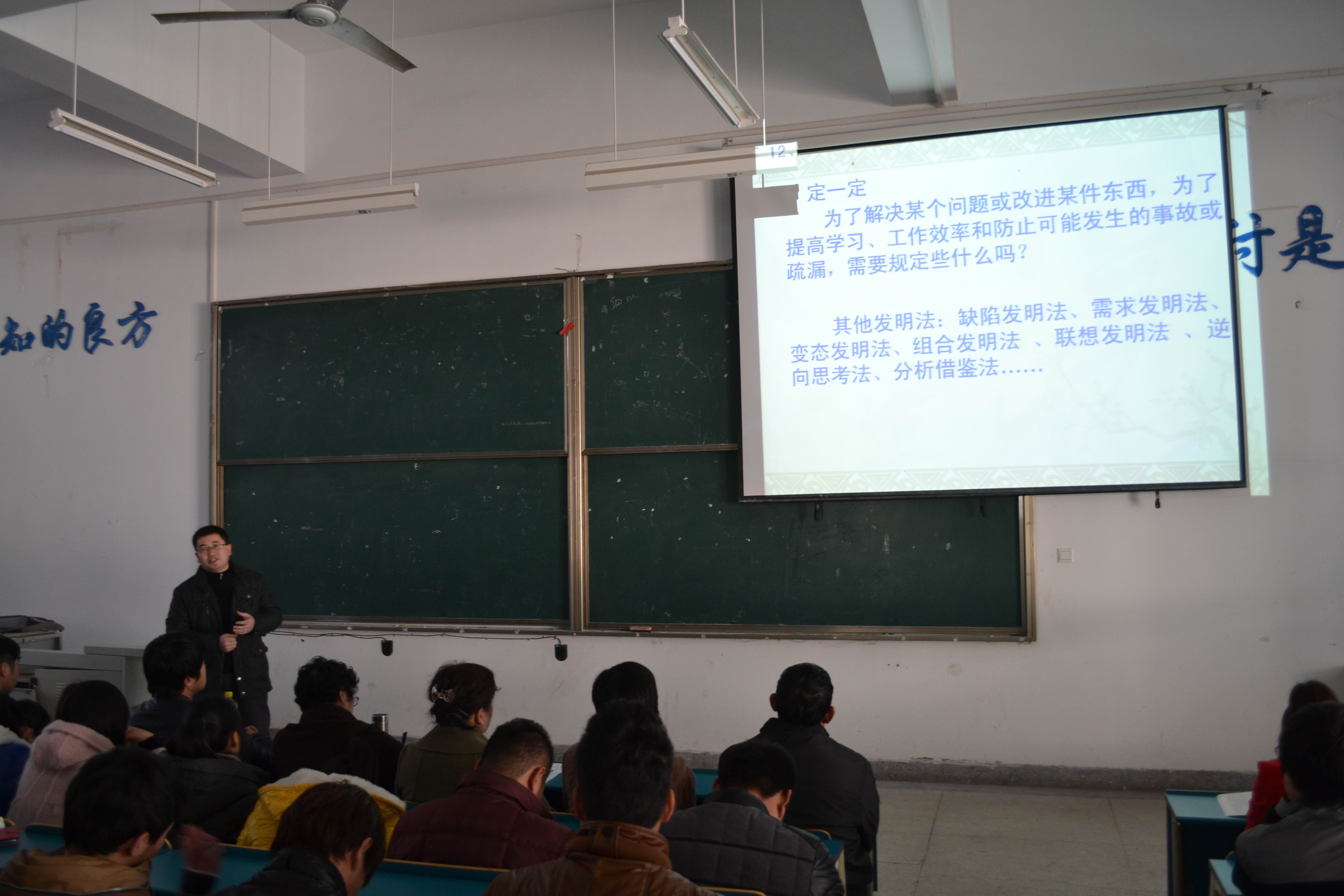 余平副教授首先从培养创新能力、创造发明方法、发明创造的过程、专利申请、专利申请文件实例演示等五个方面,以可压缩垃圾桶和防脱落眼镜架专利为实例,图文并茂,对专利基本知识、申请专利的流程、专利申请书写作要点与注意事项作了精辟讲解,使得在场师生对专利申请的全过程有了进一步了解。他还列举了大量的实例鼓励同学们留意生活,敢于提出自己的创新想法。