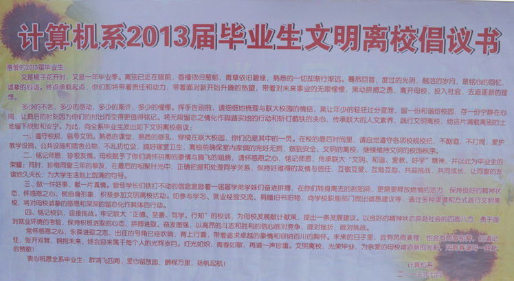 我系还发起了“做文明毕业生 为母校添光彩”的签名活动