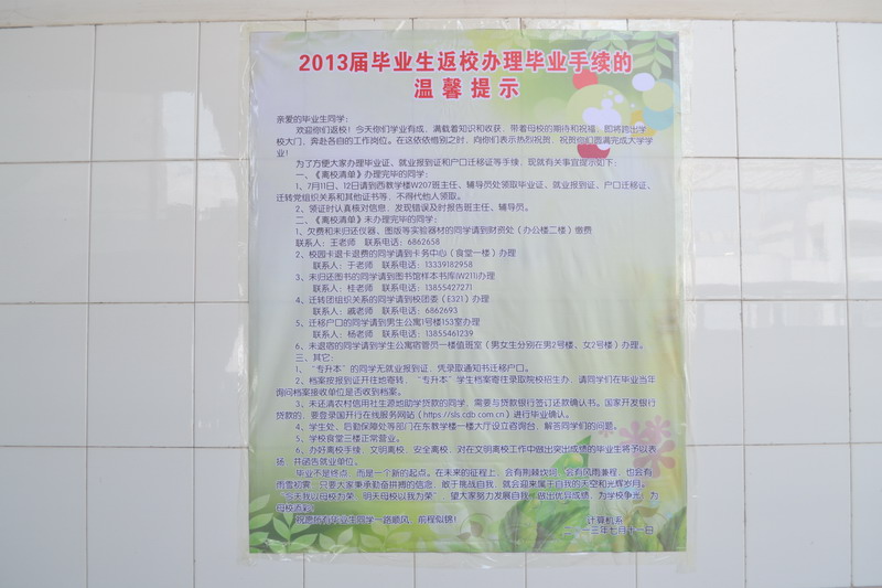 为方便大家办理离校手续,我系事先将办理毕业手续的各个环节、办理地点、联系方式、联系人等信息以喷绘形式张贴在醒目位置。
