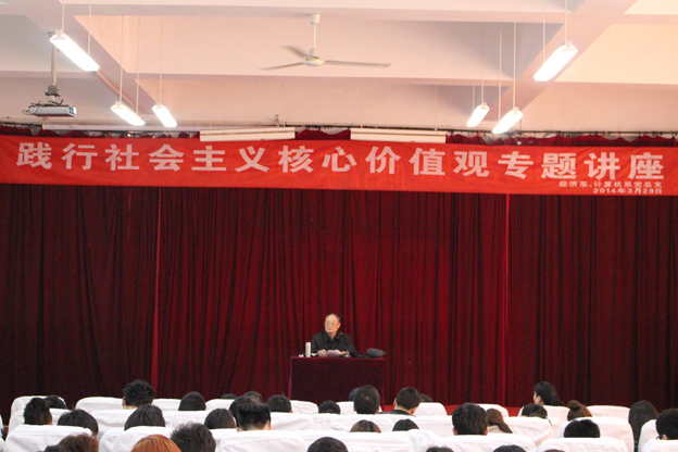 我系与经济系于3月28号下午在西教学楼220报告厅共同举办了一场主题为“践行社会主义核心价值观”的专题讲座,校关工委卢书记担任主讲,校关工委负责同志及系部师生共同听取了本场讲座。
