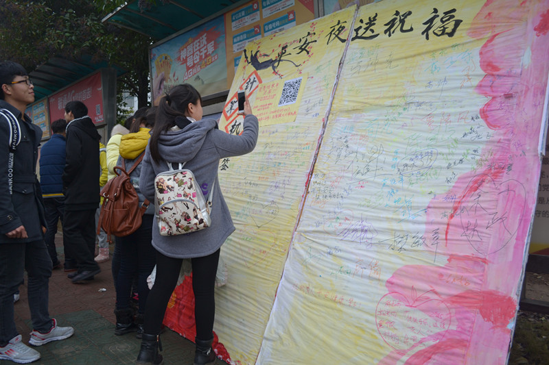 “平安夜”乃平安之夜,在西方预示着来年的幸福与平安。苹果的“苹”与“平”谐音,更象征着平平安安。活动为同学们精心准备了“平安果”,展板上的同学们书写下的声声祝福也同样表达了对未来的美好祝愿。