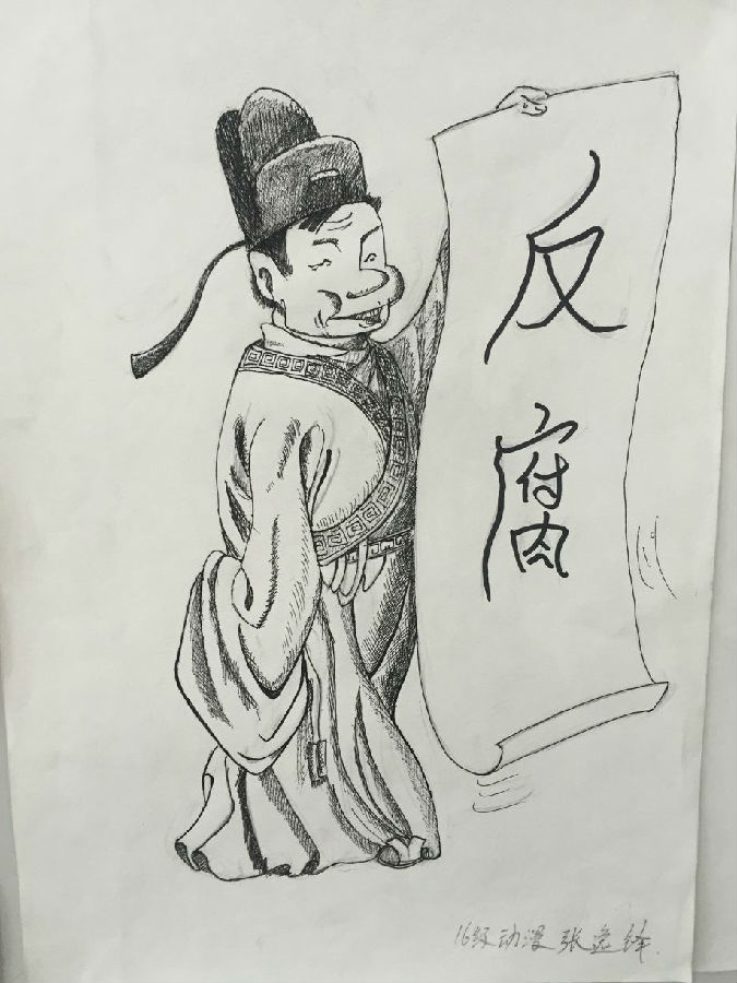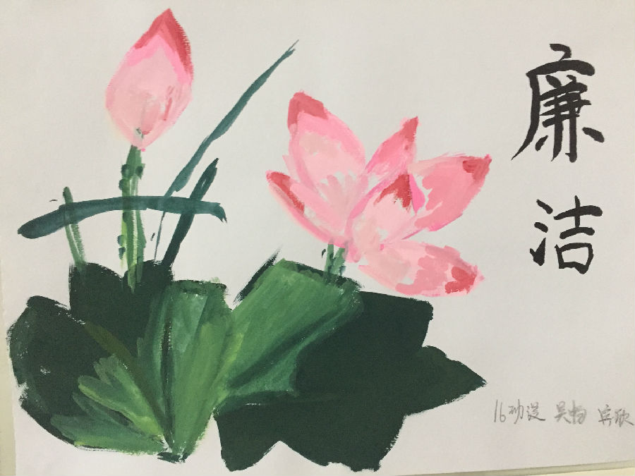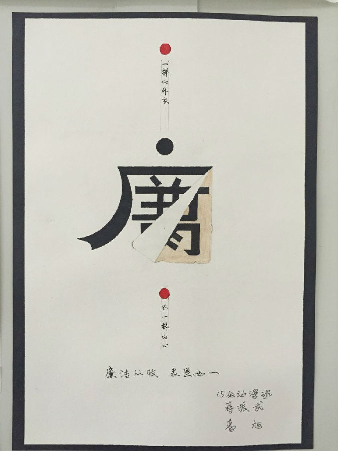 本次作品展以“正风廉洁”为主题,分别展出了书法、素描、水彩、漫画等作品。同学们以饱满的政治热情围绕廉政文化主题进行了精心创作:有钢阳正气的笔风书写“廉洁自律、勤政为民”的书法作品;有以莲花寓意出“出淤泥而不染,濯清涟而不妖”之廉政精神的水彩绘画作品;有以清正廉洁之“拳”打碎腐败之“石”来弘扬廉政之风的漫画作品;更有寓意踏上腐败之路即是踏上剑尖之时,从而告诫我们远离腐败、清正做人的素描作品。