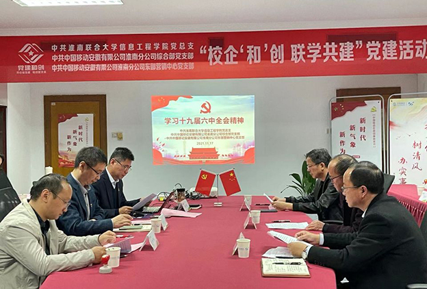 在交流互学座谈会上,参加活动的领导和党员同志先后做了交流发言,共同学习了《中国共产党第十九届中央委员会第六次全体会议公报》。信息工程学院党总支与淮南移动东部营销中心党支部、综合党支部签订了《“校企‘和’创联学共建”倡议书》