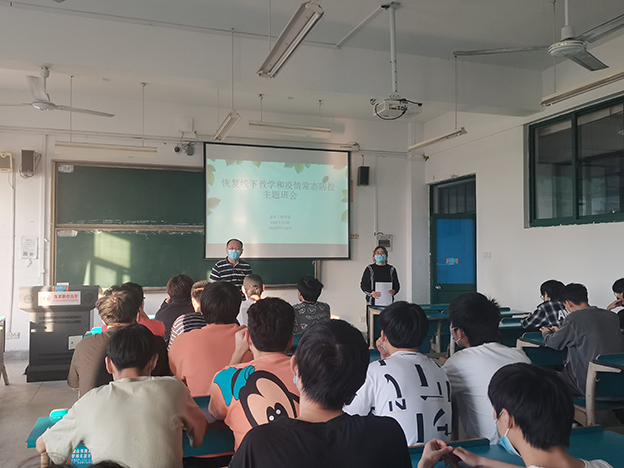 5月17日,根据学校主要领导指示和学校工作会议部署,信息工程学院组织在校生班级召开恢复线下教学和疫情常态化防控主题班会。学院党总支书记方刚参加所有班级主题班会。